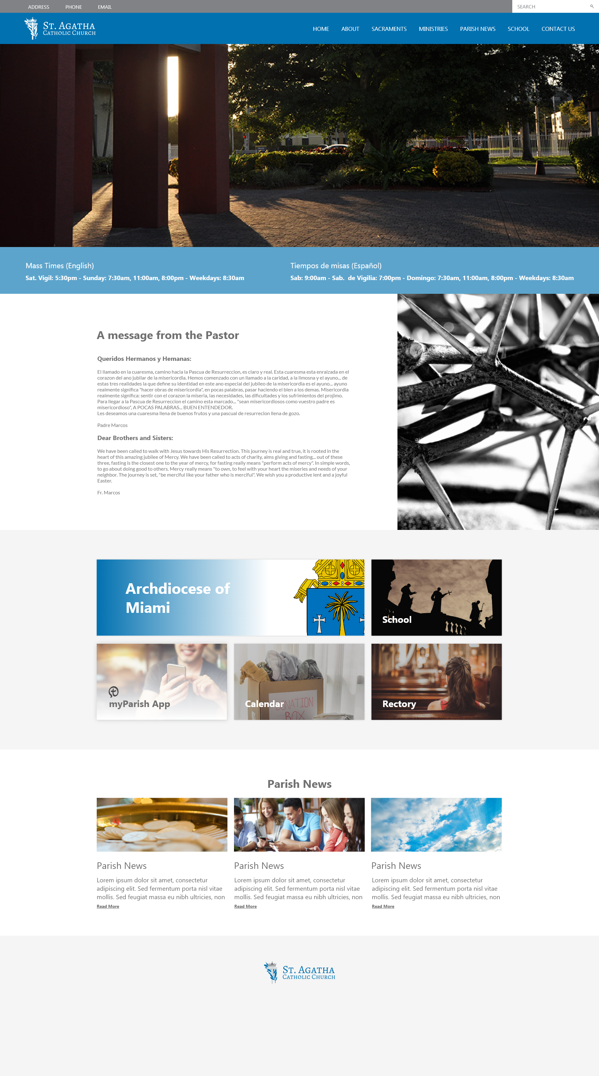 I wanted to send you the first proof of the homepage for the parish, we will use a similar one (different info for the school obviously)