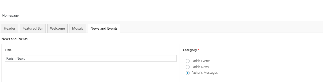 In the backend for the News and Events tab, if I switch the category for the News Section of the Homepage, the News still pull from the Parish News category and not the category selected.