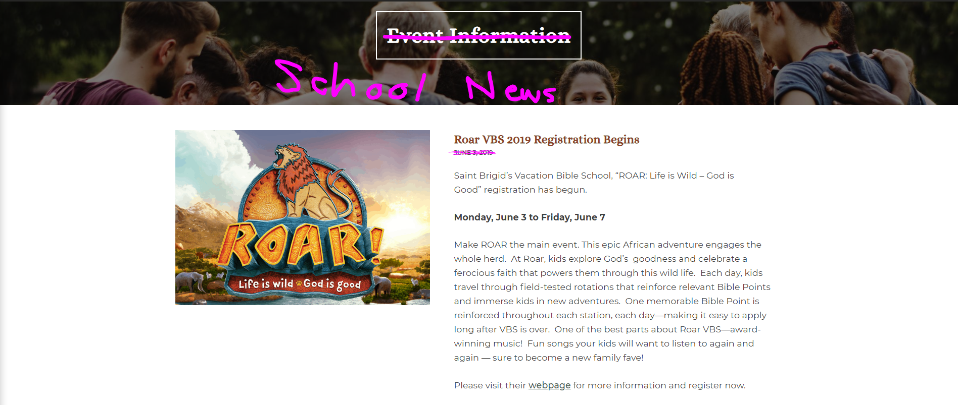 may have some input on this and it may be changed later since I did not see a design on it, but a single post such as this one: https://church.agatha.diocesanweb.org/parish-news/636/ | https://school.agatha.diocesanweb.org/school-news/96/