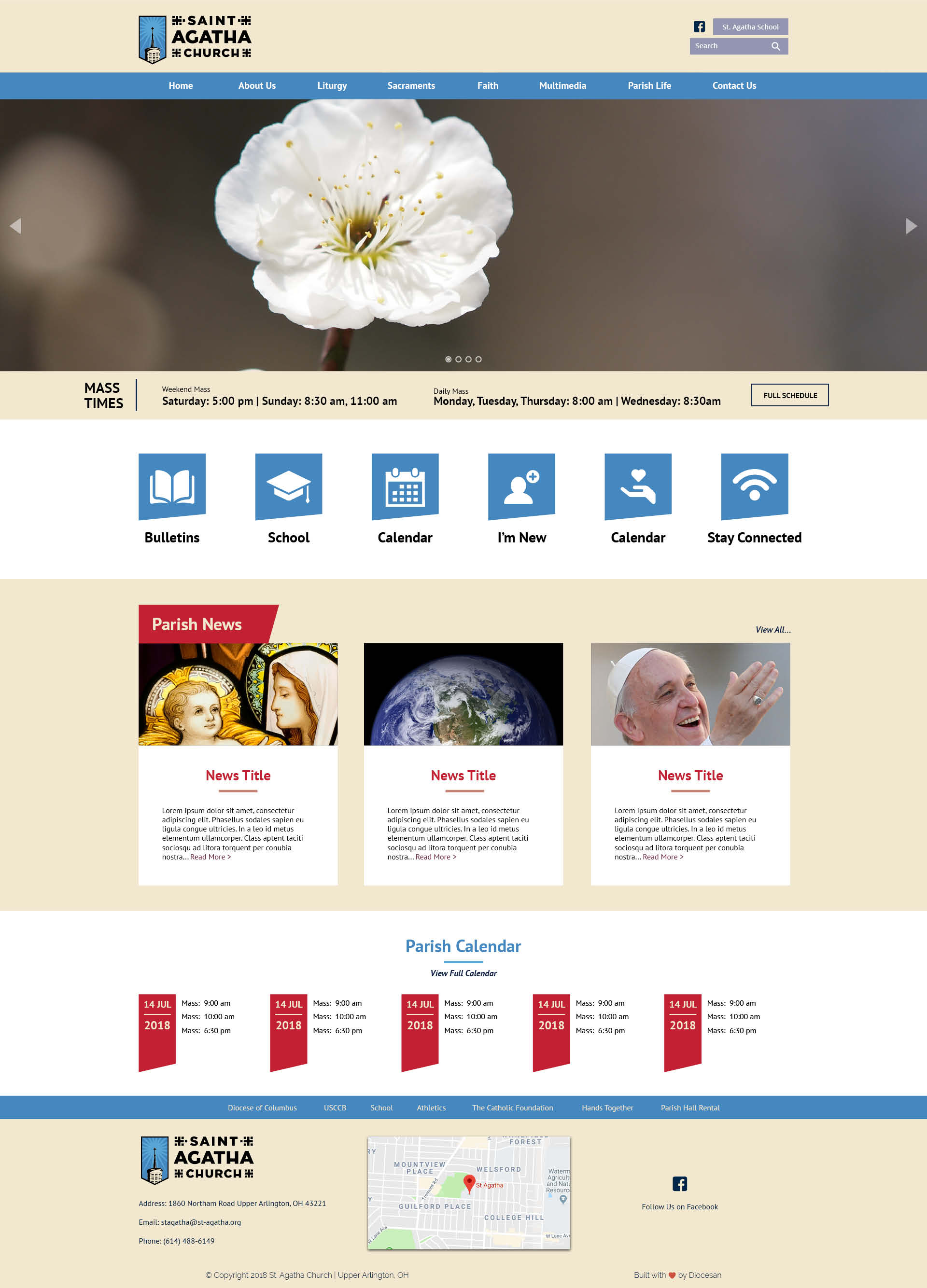 Also, could you make the color under the three pictures in the parish news section more of a tan or a grey/beige (griege) – I know the current color in this version is what we gave you but we still feel it isn’t right. Sorry for being a pain about this! We are both very visual and we need to see the colors together in the layout before we know if it’s going to work. We attached a pic with a background similar to what we are thinking (background color).