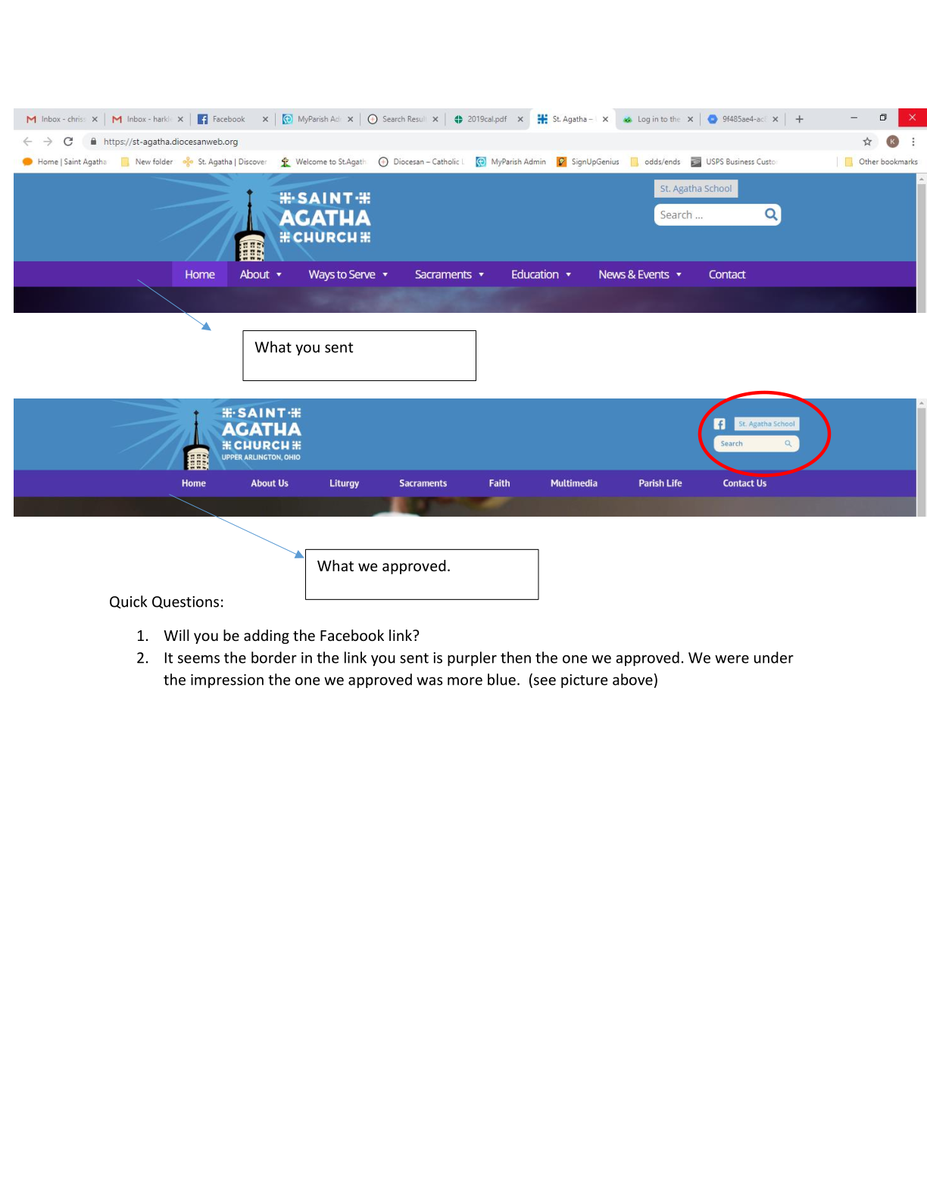 As for the Facebook logo, it is an option that we simply have to put the link in. So far, I have only been able to find the school's Facebook page. Is this the link you'd like to use? https://www.facebook.com/SaintAgathaSchoolColumbus/