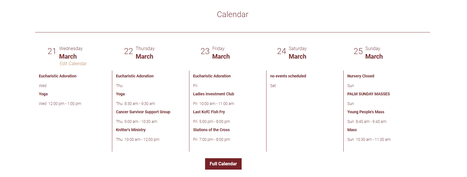 * I still have a concern about the calendar on the main page. Today, Palm Sunday’s events are listed under the prior day. Since Saturday has no events, I put one in to see if that would kick Sunday’s events back to Sunday without success. Can you tell me why events are appearing under the wrong day? Google calendar link: https://calendar.google.com/calendar/r