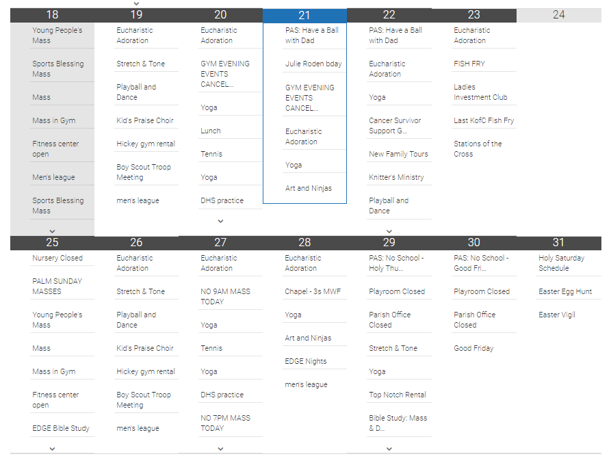 What this means for you is that if there are no events on a day, you should put an all day event that says "No Events" or something similar. Since All Saints seems to have something nearly everyday, this will be tedious, but not occur very often. For example, next month, there are events on each day. Looking at your calendar at the beginning of the month should be enough to decide what days you should create a "No Events" event.
