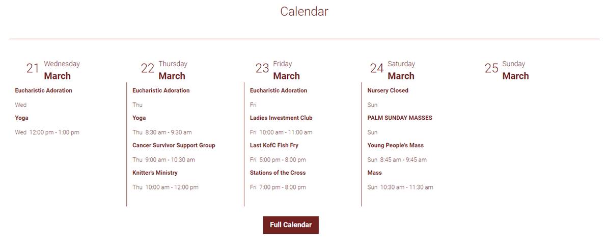 1. Improved homepage calendar - Still having a lot of trouble with our calendar. Is there a better option for us here? We are considering calendarwiz.com. Is there a better plug-in or other 3rd party that other parishes use?