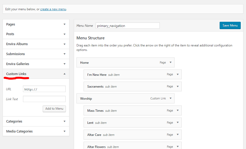 On the left side, you will see Custom Links. This is used for linking off site, or straight to a document, but can also be used for blank/unclickable menu items. Some examples of this are Worship, Programs & Events, Basketball, and Education. - Add a fake custom link