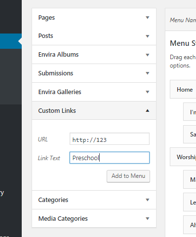Since we will be deleting the contents of the url, you can just type whatever into the url area. Link Text is what the menu item will be. In this case, "Preschool" is what we want. Click "Add to Menu." - Move the Menu Item as Needed