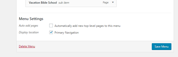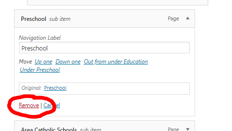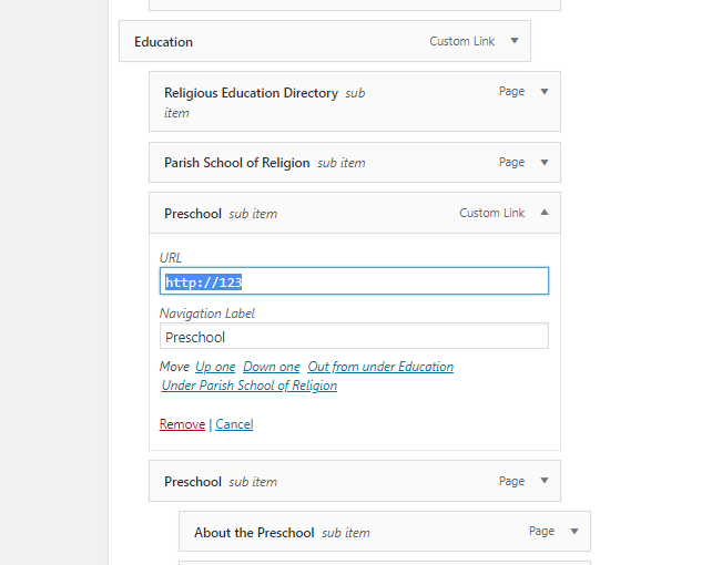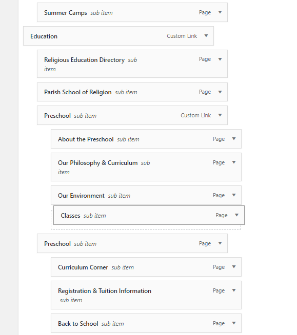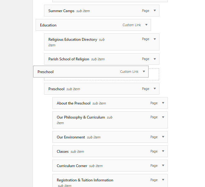 Now we need to move the sub items under the new Preschool custom link. Similarly, we can click and drag them to their new spot. Be sure that they are indented under the new Preschool as subpages. - Delete Other Page