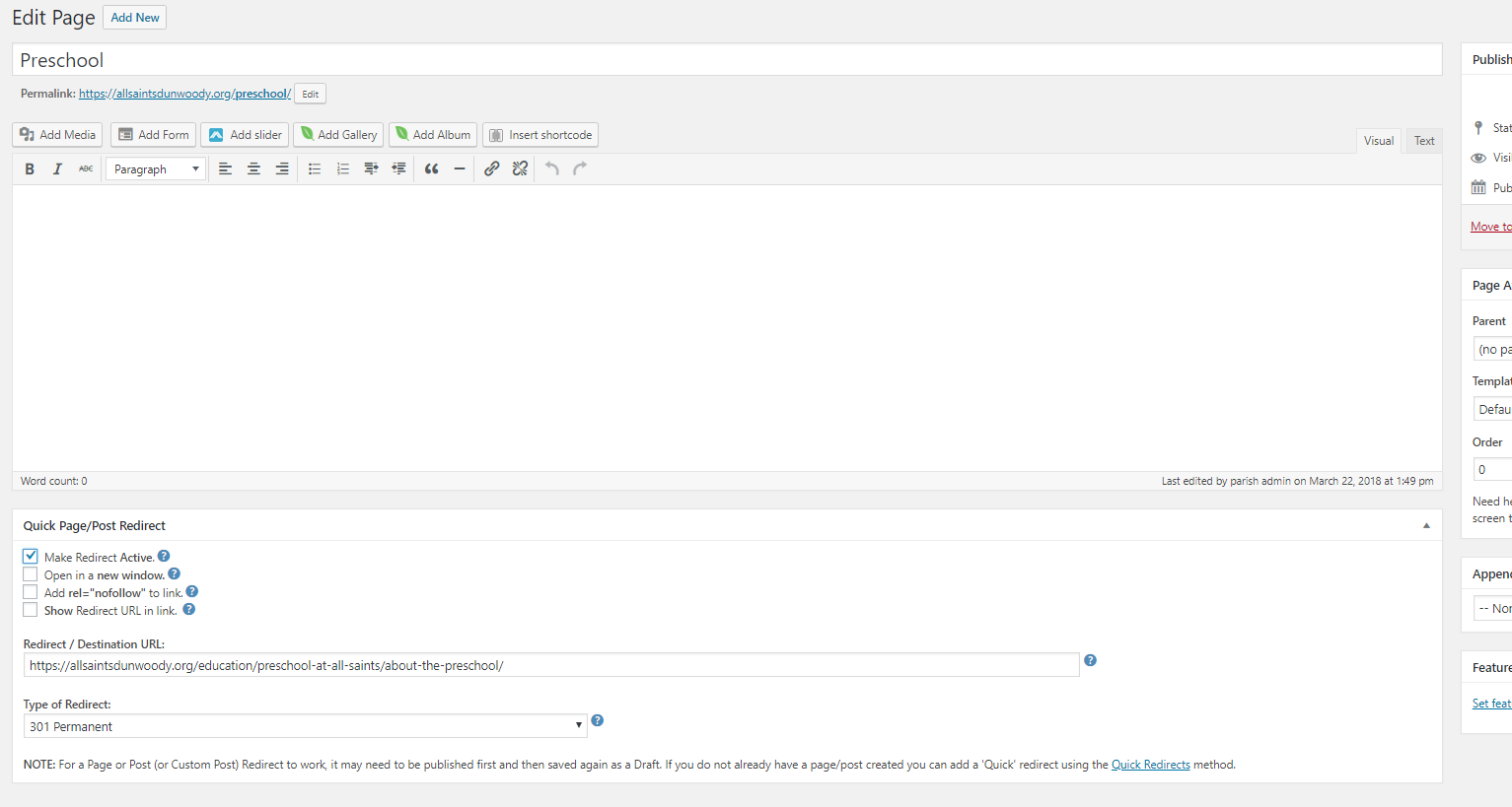 To get around this, I created a private page (allsaintsdunwoody.org/Preschool) that automatically redirects to the About the Preschool page. But I can’t find how to automatically reroute a page. Is this possible?