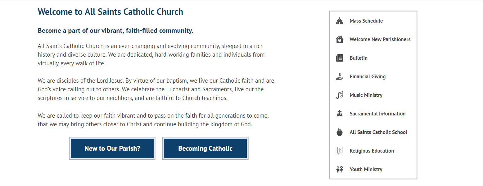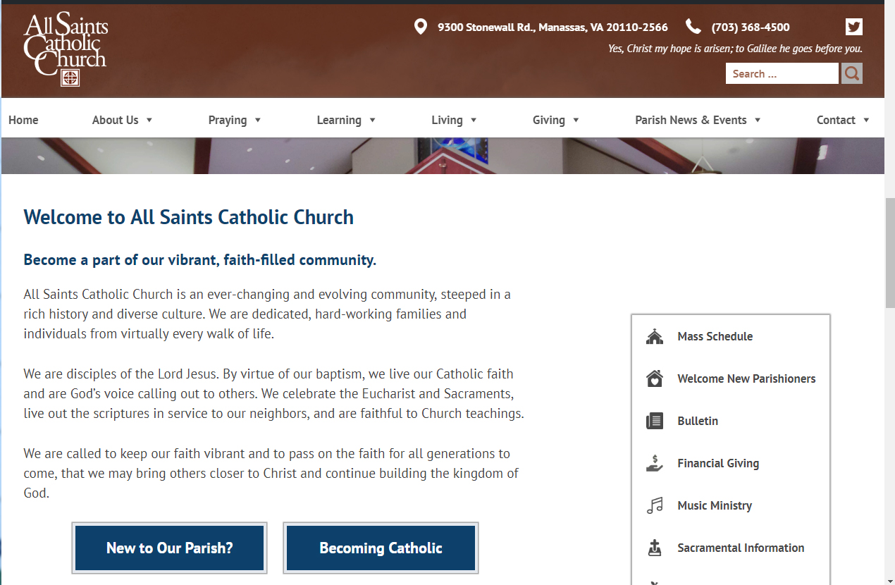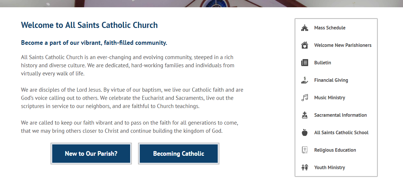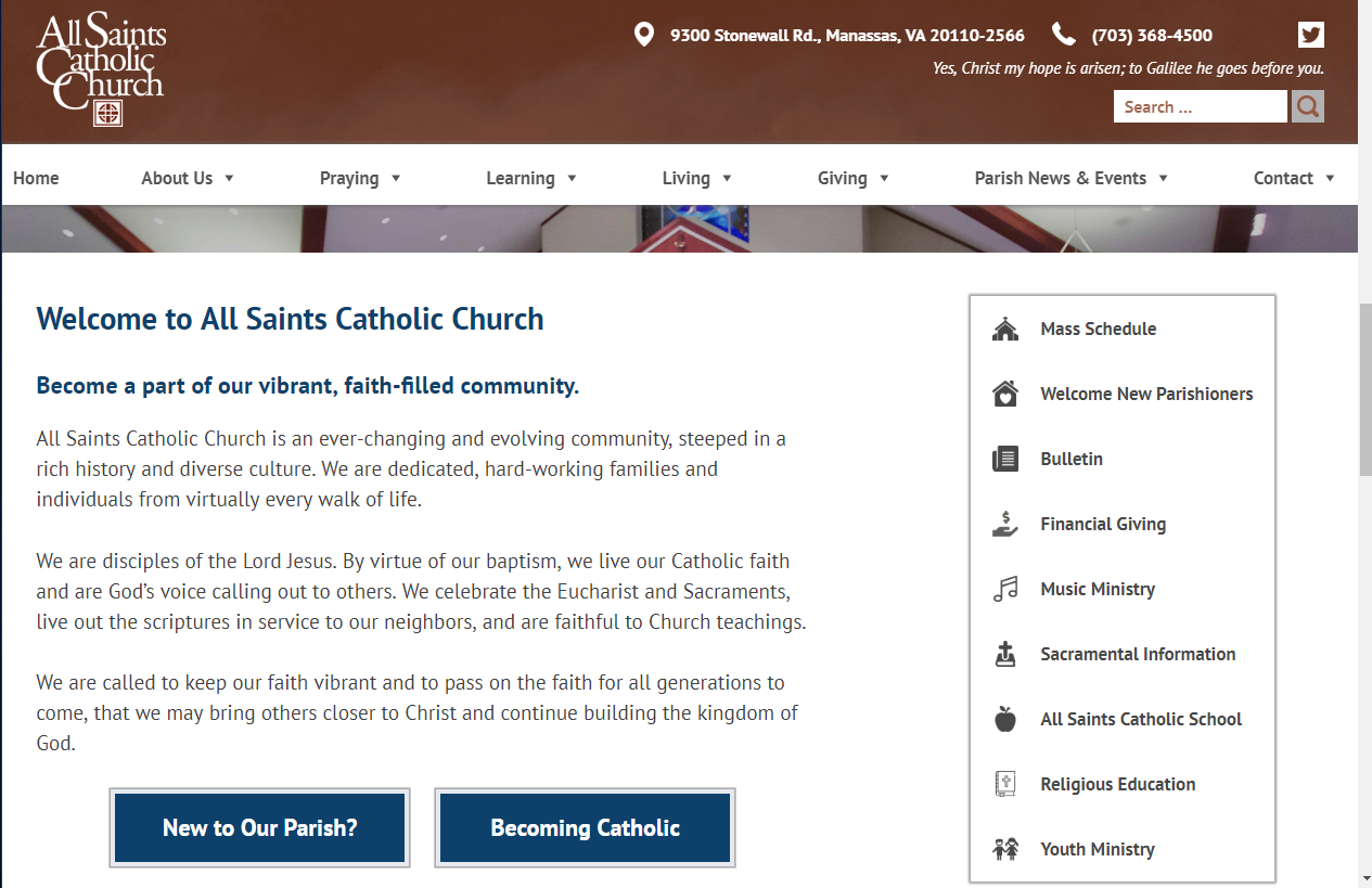 Thank you again for providing us with a link to the All Saints Catholic Church parish website in development with Diocesan Publications. Sorry for the delay in finalizing the website, but we didn't have the resources to complete the website during the fourth quarter.