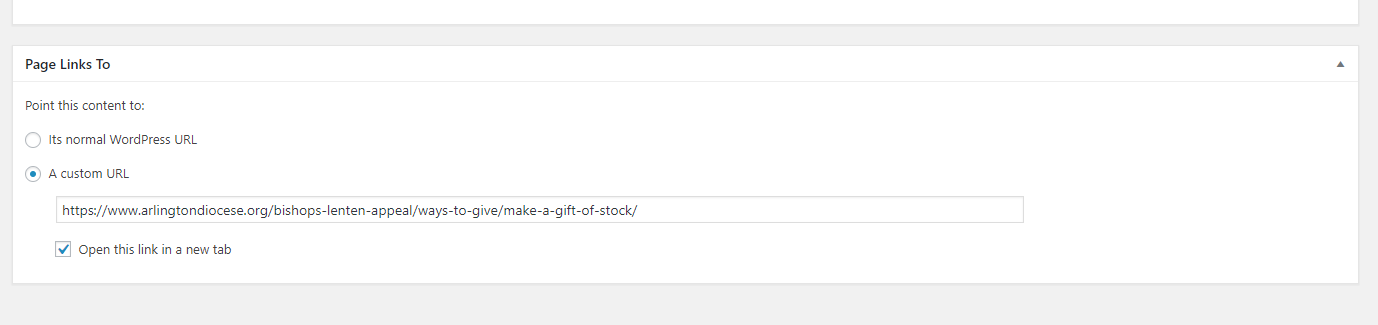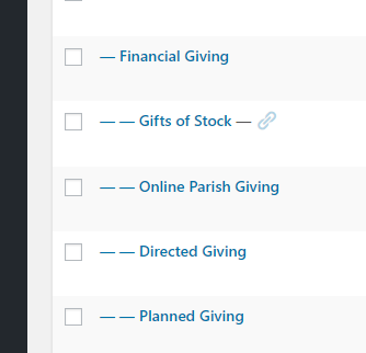 * If you click on Giving/Financial Giving in the top navigation, you will see that there are four flyouts: Online Parish Giving, Directed Giving, Gifts of Stock, Planned Giving. However, if you click on Online Parish Giving and look at the on-page subnavigation on the right, it doesn't include the Gifts of Stock link to https://www.arlingtondiocese.org/bishops-lenten-appeal/ways-to-give/make-a-gift-of-stock/. That's because it is an external site. Is there a way to represent that page in the subnavigation so it mimics the flyouts on the top navigation. Not a big deal if you can't make it happen, but I thought I would mention it.