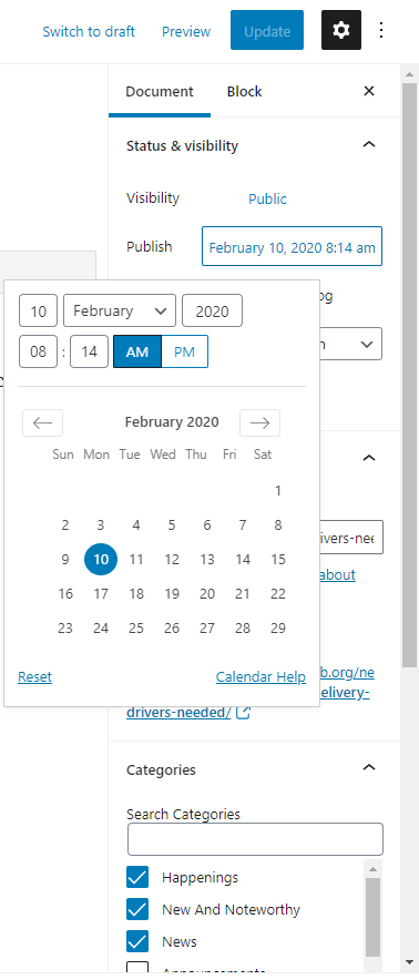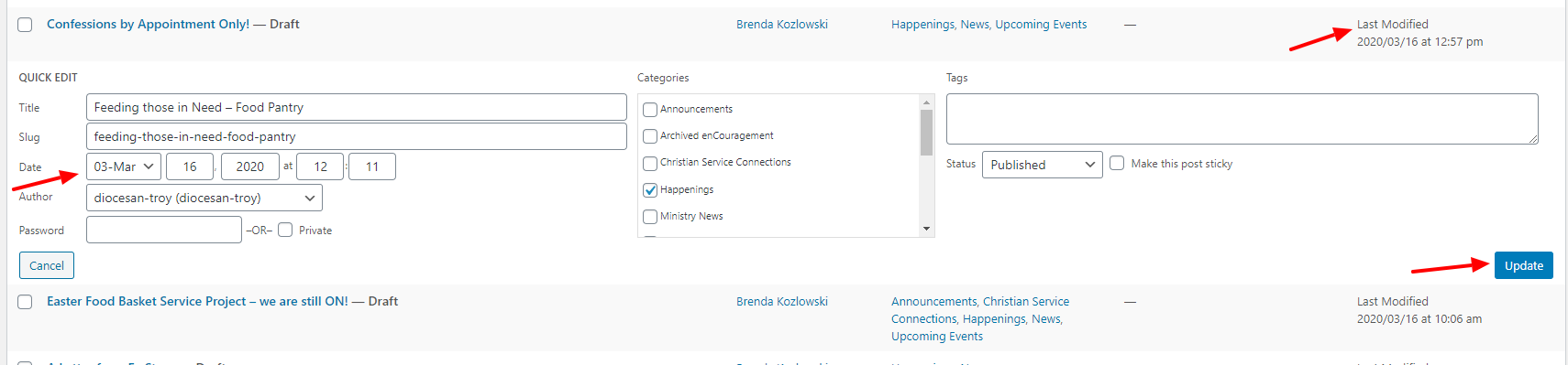 As for the post, there is actually an easier way to move the Food Pantry up higher in the list. The ordering is done by the Publish Date, and we can adjust that in two places and both will work the same way.