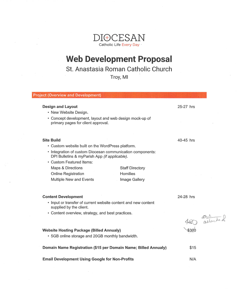 It was great talking with you! Below is a quoted cost for your site project based upon what we discussed in our meeting. Our sales manager did inform me that he would cover 100% of the website cost if you sign a 6-year bulletin contract with us at Diocesan. Please let me know if you have any questions! If you decide to go with us we can work on getting you a bulletin contract (we will need the bulletin contract to be signed in order for the signed website proposal to take effect).