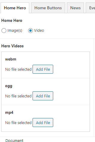 ✔ Homepage - backend - Home hero tab - Video selector's mp4 option doesn't limit choices to only mp4 like it does with ogg and webm