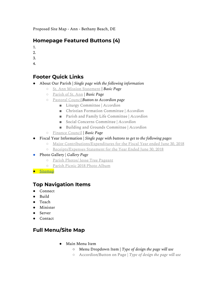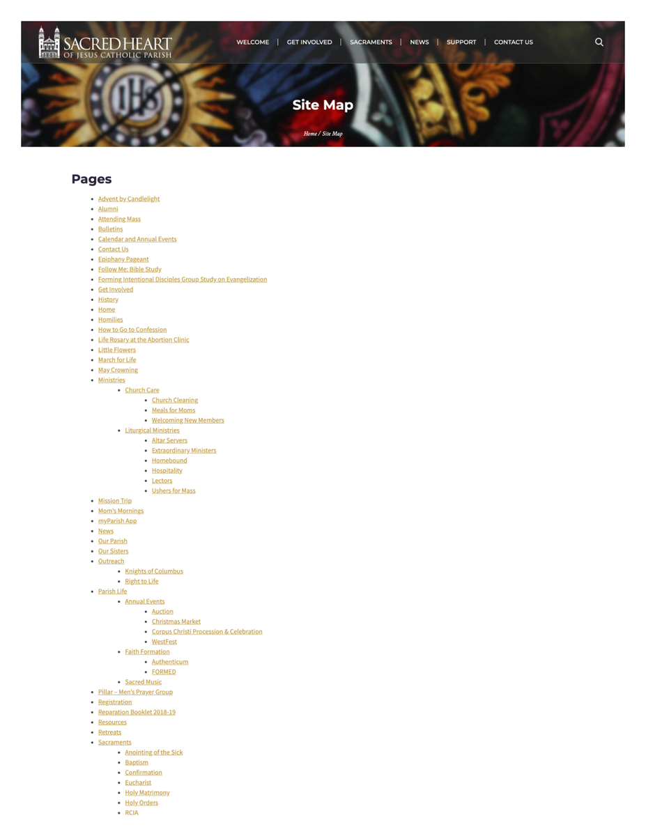 That definitely helps explain. Since there are 28 items as 0/unctegorized, I have recreated a sitemap for you that reorganizes the website, adding the category of CONTACT for quick access to where the parish is and how to reach you and replacing "Organizational" with CONNECT. The highlighted items were currently uncategorized, so that you can see where I placed them.