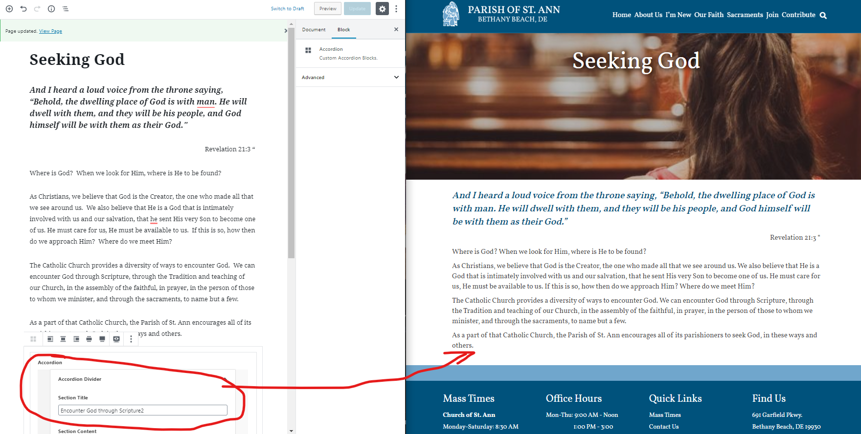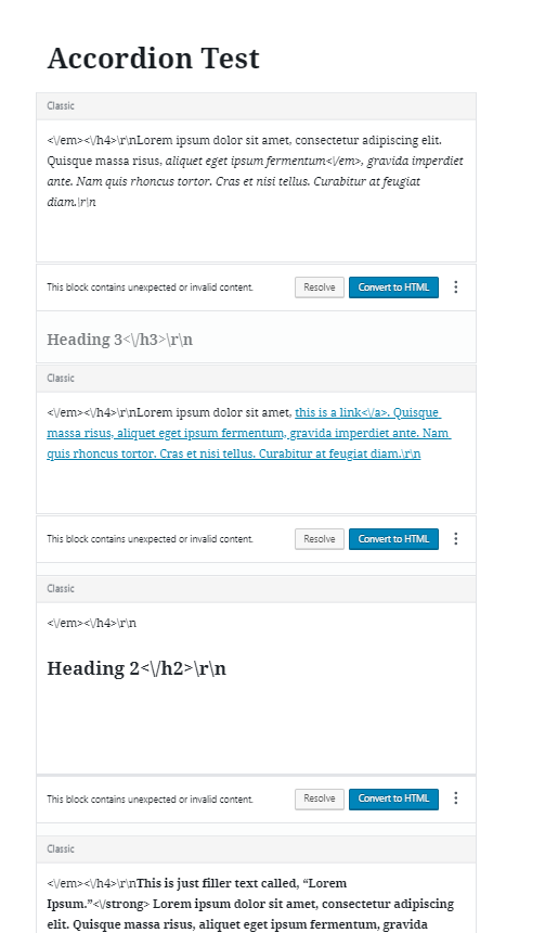 Sometimes the accordion block will be very testy and go crazy (https://stannbb.diocesanweb.org/accordion-test/) like the image on the left which is of the backend and other times it just won't show on the front end (https://stannbb.diocesanweb.org/seeking-god/) (picture on right)