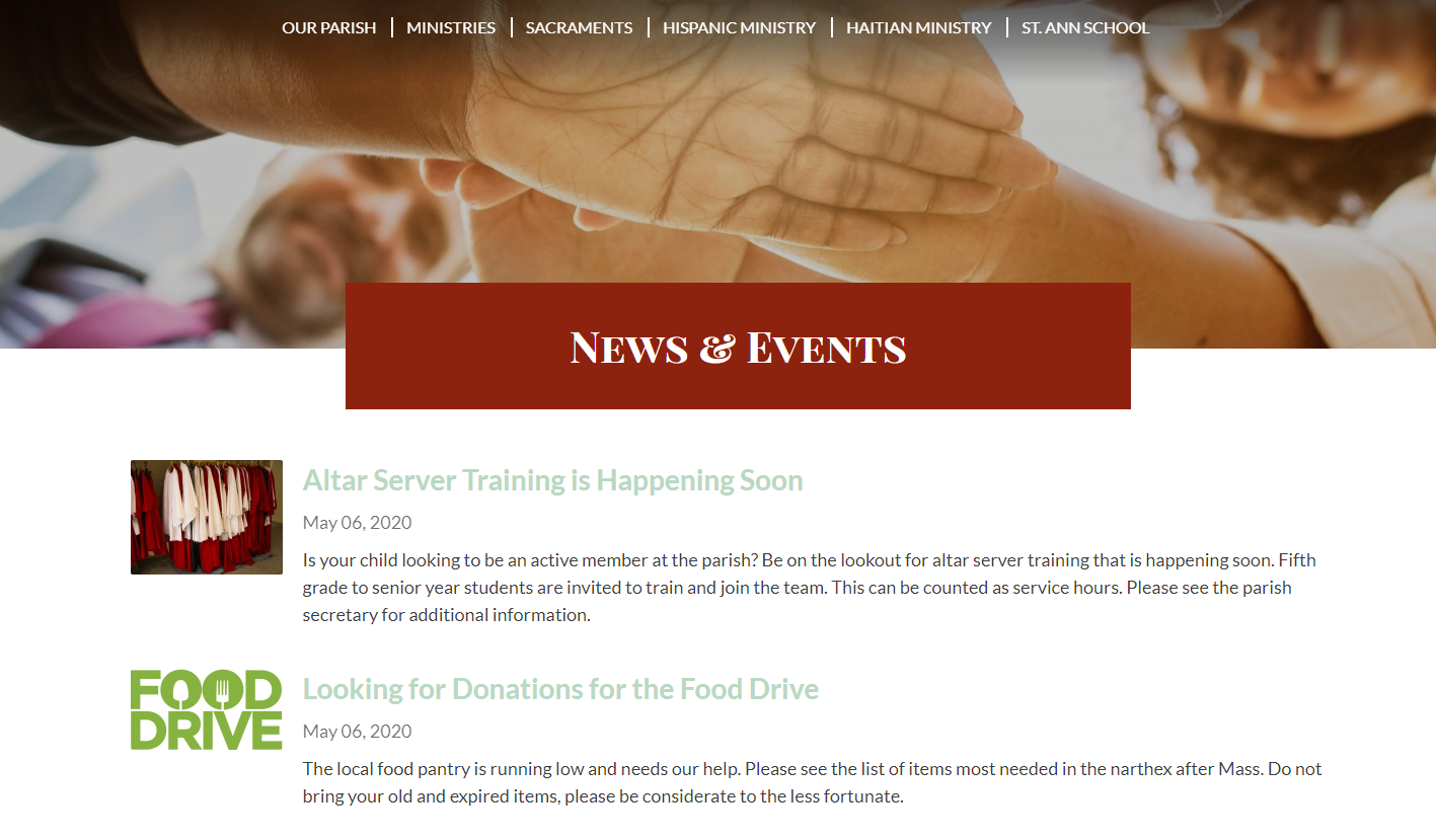 From the list: Build ✔ Archive - Page header is wrong color also Cody A. added this on May 27, 2020 Completed May 28, 2020 by Sam P. Assigned to Sam P. Notes https://stannwpb.diocesanweb.org/category/news-events/ image.png 977 KB • Download Comments & Events Sam Pohlman completed this to-do. May 28, 2020 at 12:41 PM