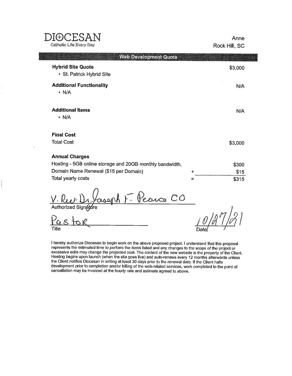 Thank you for returning the signed proposal. We are very excited to work with you and bring a new website to St Anne!