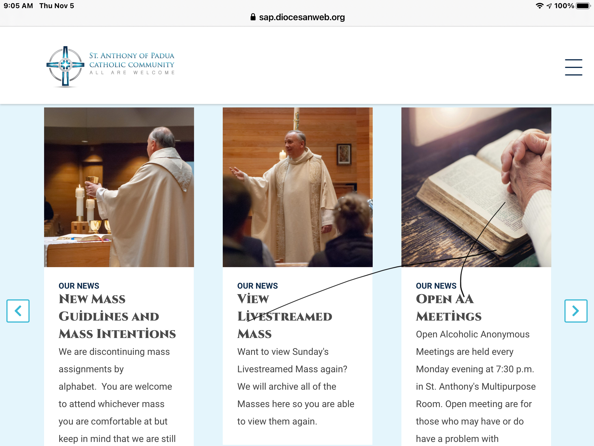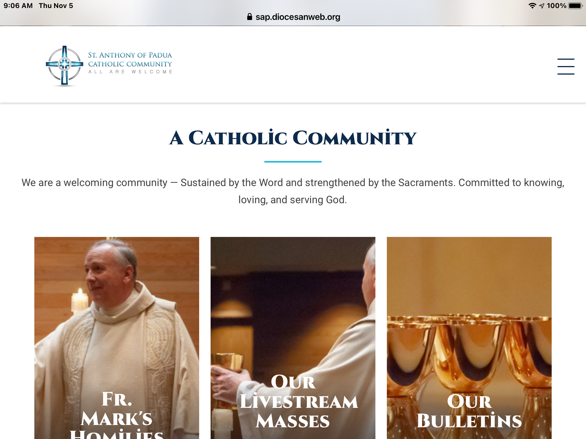 6 Under Parish Resources: The homilies link should be a separate link than the livestream link. Fr. Mark posts his homily every week and it is not always the same one that is on the livestream mass. https://www.saparish.com/homilies/