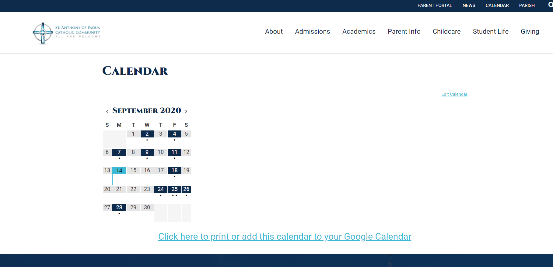 From the list: Build ✔ C/S - Calendar needs to be made full width Cody A. added this on Sep 14, 2020 Completed Sep 17, 2020 by Kyle B. Assigned to Kyle B. Notes https://sap.diocesanweb.org/school/about/calendar/ image.png 119 KB • Download Comments & Events Kyle Brown completed this to-do. Sep 17, 2020 at 6:56 PM
