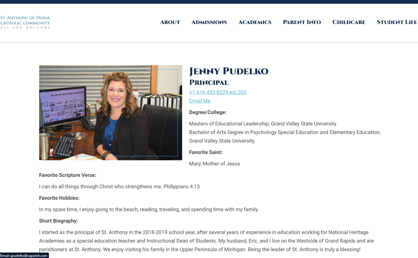 From the list: Build ✔ Staff Single - Email goes to Not found page Cody A. added this on Jan 06, 2021 Completed Jan 07, 2021 by Kyle B. Assigned to Kyle B. Notes https://saparish.com/staff-contact/?staffEmail=jpudelko@saparish.com - Email link for Jennyhttps://saparish.com/school/staff/jenny-pudelko/ image.png 528 KB • Download Comments & Events Kyle Brown completed this to-do. Jan 07, 2021 at 4:26 PM