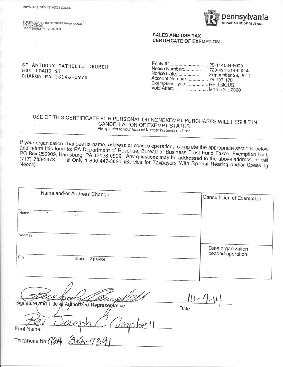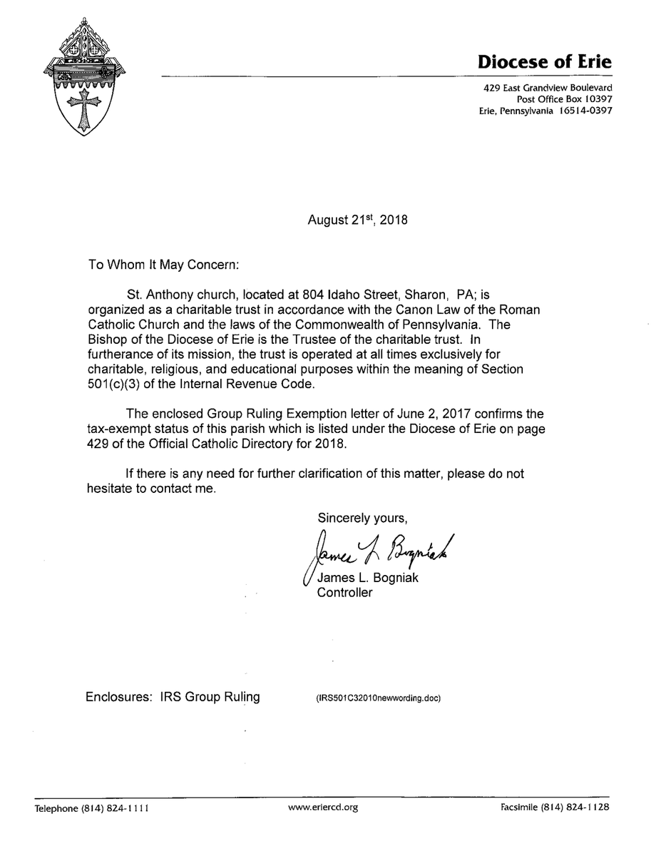 ----- Forwarded Message ----- From: James L. Bogniak <jbogniak@eriercd.org>To: St. Anthony 31110 Adalbert 31108 Stan 31117 <themustardseed3@yahoo.com>Sent: Tuesday, August 21, 2018, 10:43:22 AM EDTSubject: FW: St. Anthony IRS exemption letter