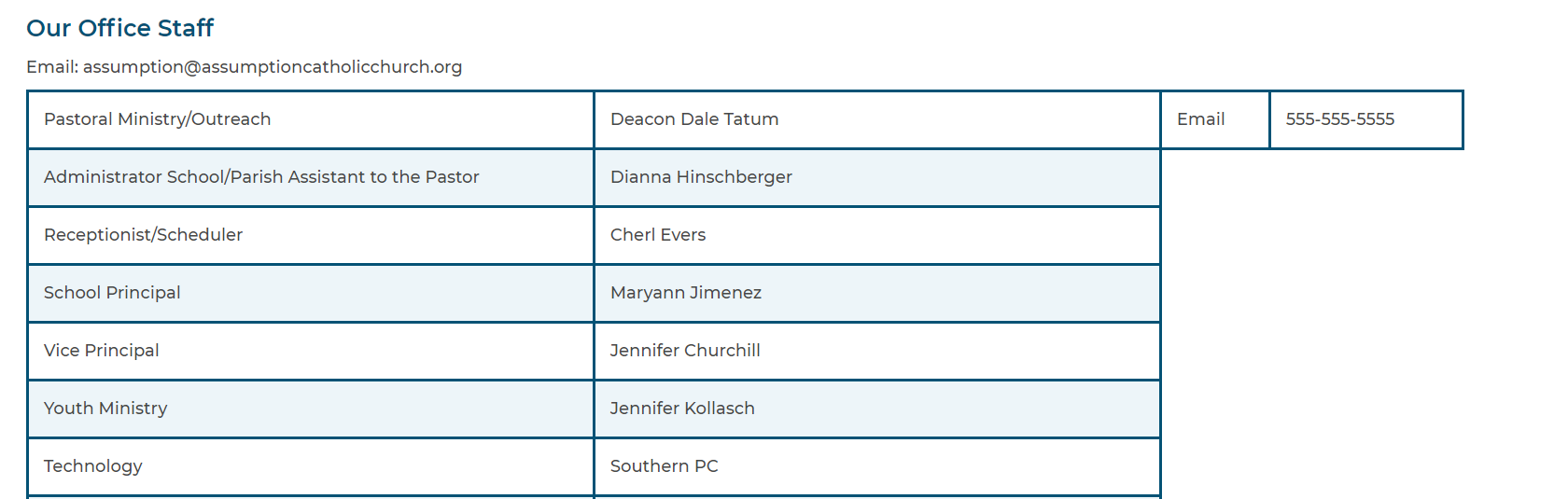 ✔ Staff Page - In the "Other Staff" Table, can you add an option (ACF) for email and another for Phone