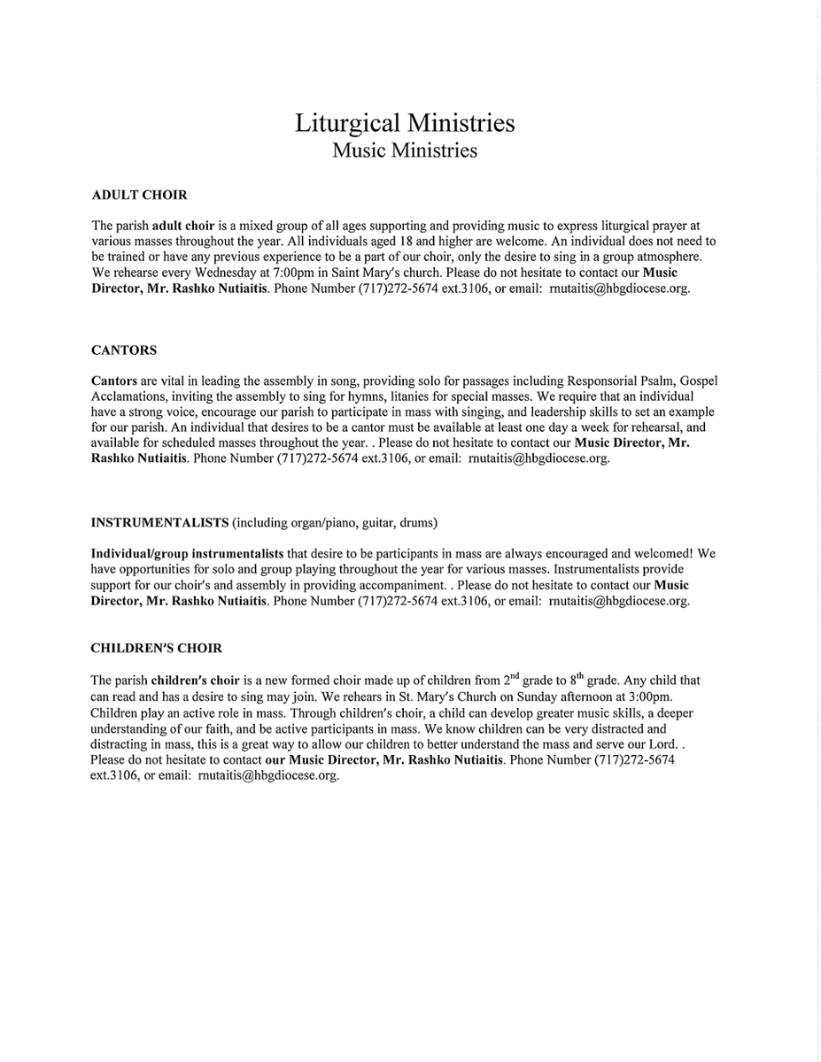 Here is some information for the website. You may use everything except “Liturgical Ministries”. They need to be redone because we have a new director of music.