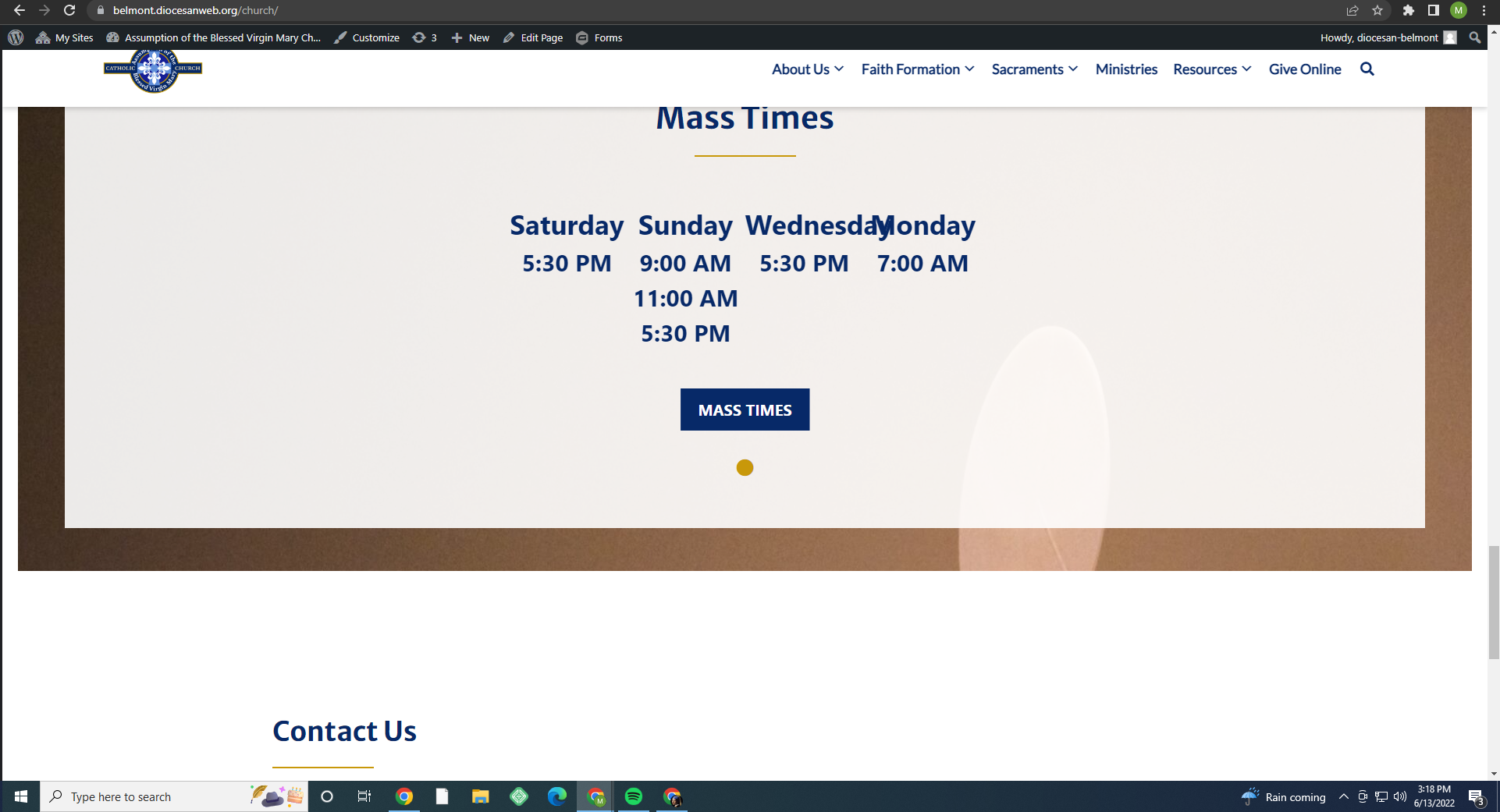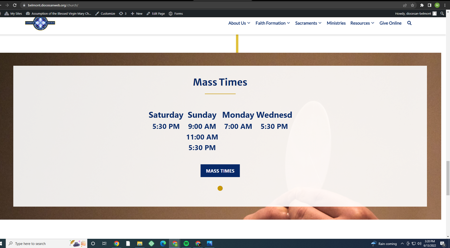 To-Do’s will have the following in the description:o Site URL: https://belmont.diocesanweb.org/church/o General Need: mass times text on homepage is very funkyo Description: info is all correct on the backend but the word "Wednesday" is doing some wild stuff on the home page banner only.o Screenshots or Video: (optional)o If Paid Support, who approved the ticket?
