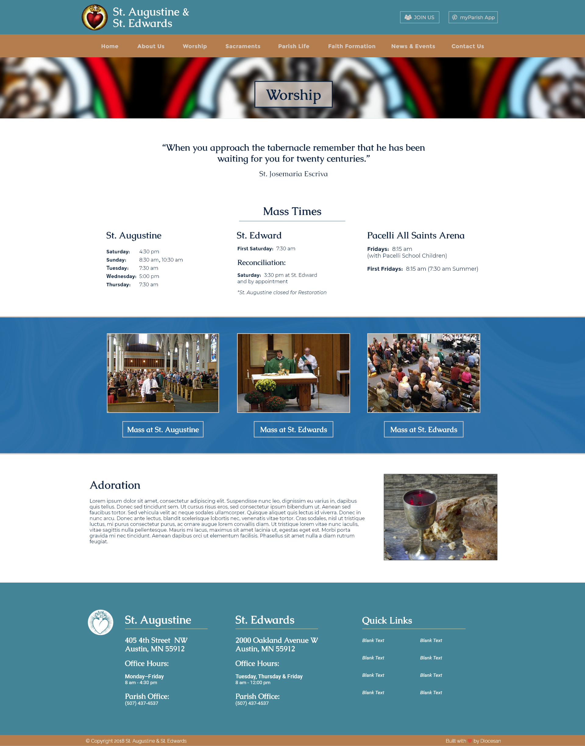 - The places where there is text with a box around it, like "join us" "aug 18th" "more bulletins" on the home page and "Mass at St Augustine" etc. on the sub page, seem inconsistent in coloring/style - some are white, some are brown, some have a different color text inside vs for the box, etc. Can we unify those in style whenever they appear?