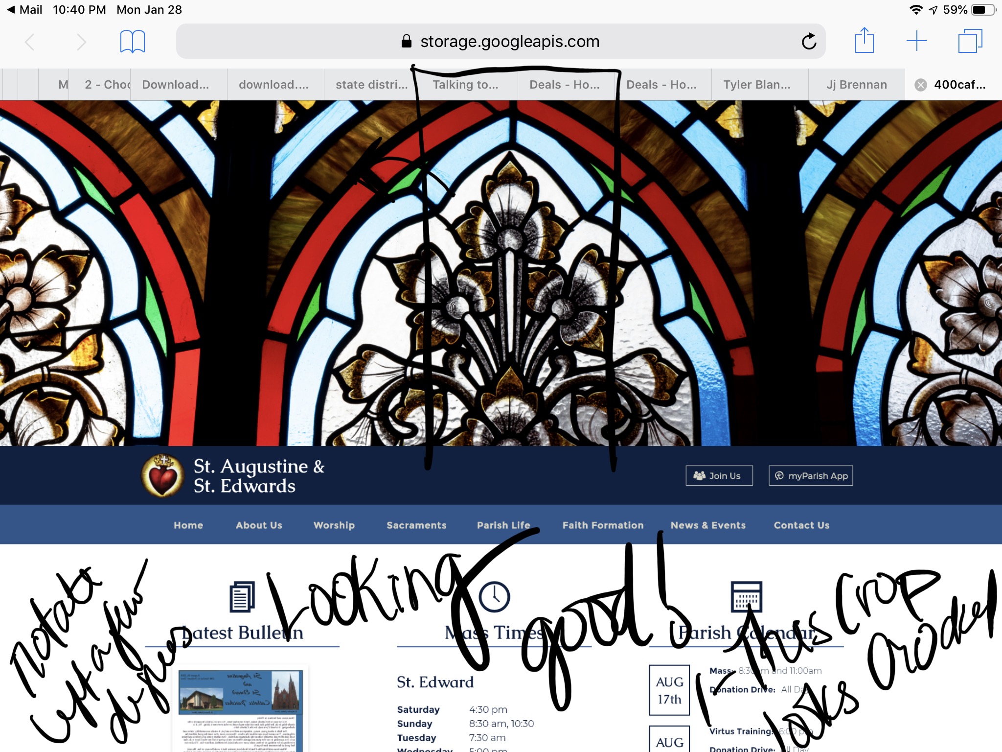 Finally, Jaci was thinking the main page stained glass image looked slightly rotated - see her notes on the attached image.