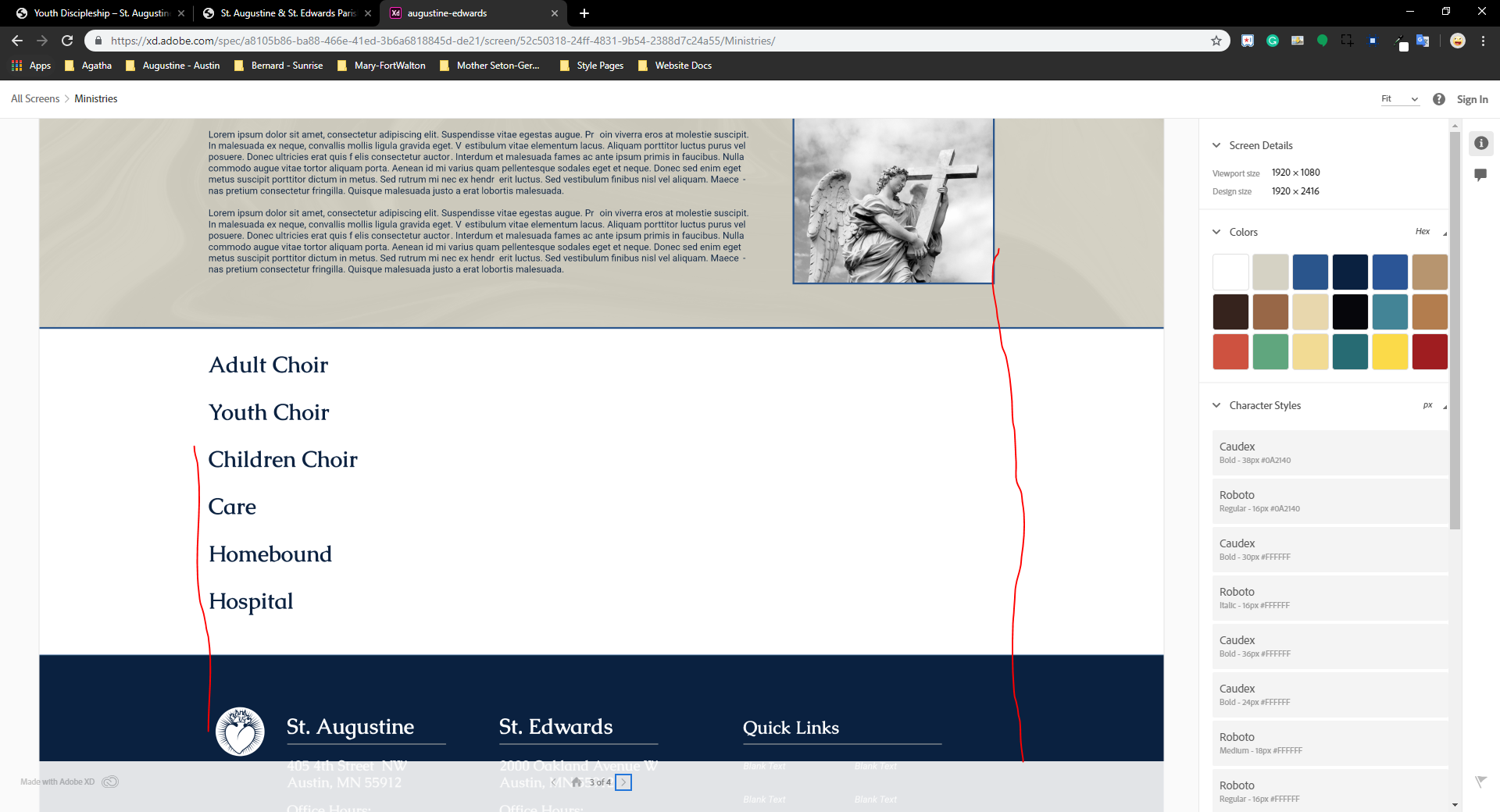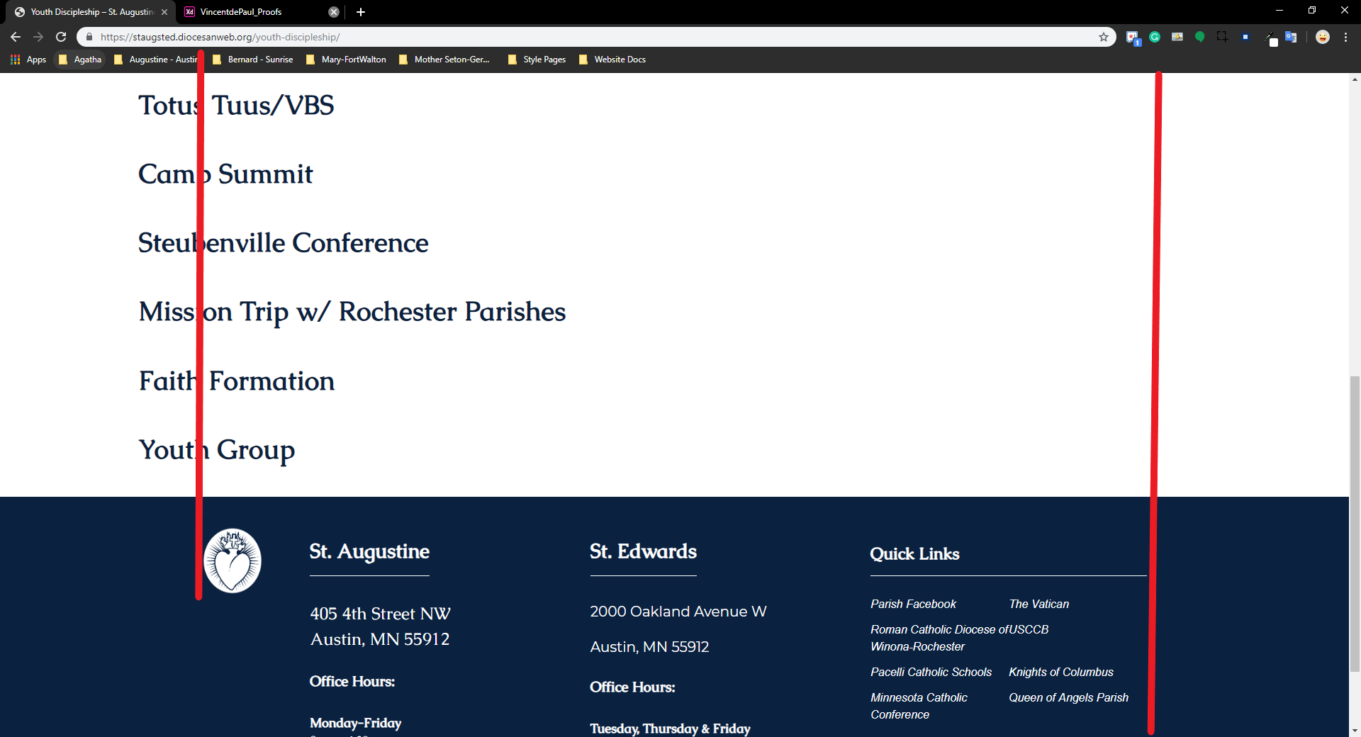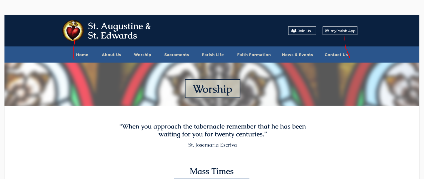 The content needs to be aligned with footer and the menu needs to be aligned with them. The logo and myParish App box in the masthead can be slightly outside of those lines, but only slightly.