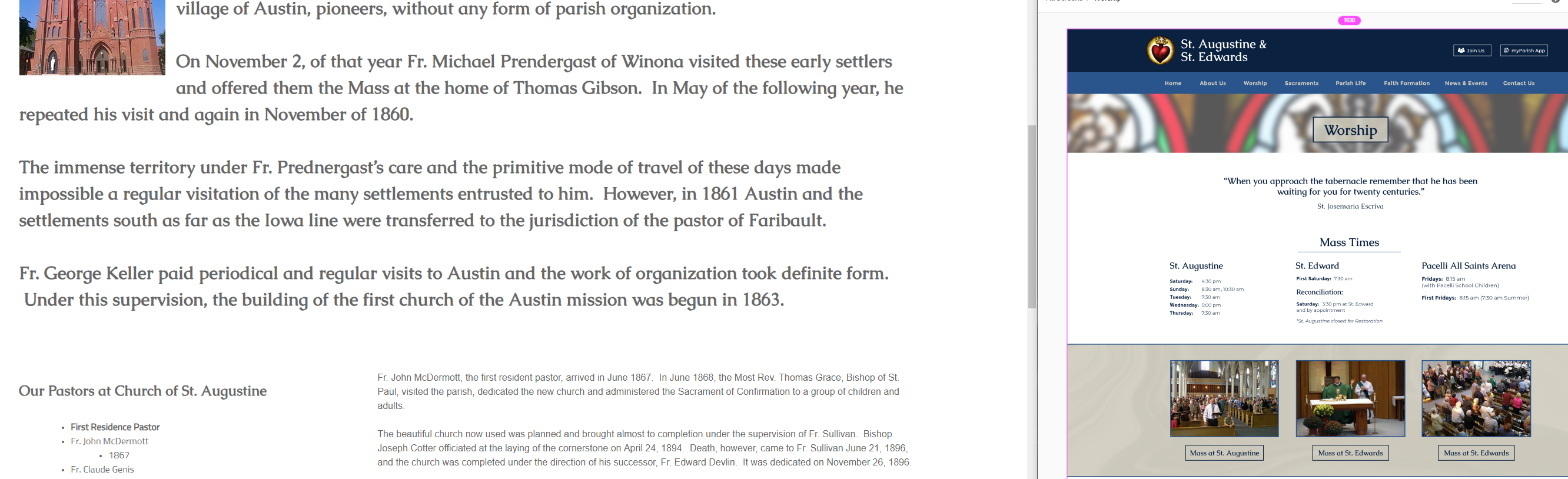 Gutenbergblock ends before "Our Pastors at Church of St. Augustine" which is an h4. The "normal" gutenberg text above it is bigger than it. Make it smaller, see proof of Worship page, make font-size like the times and notes. Thanks. https://staugsted.diocesanweb.org/styles/