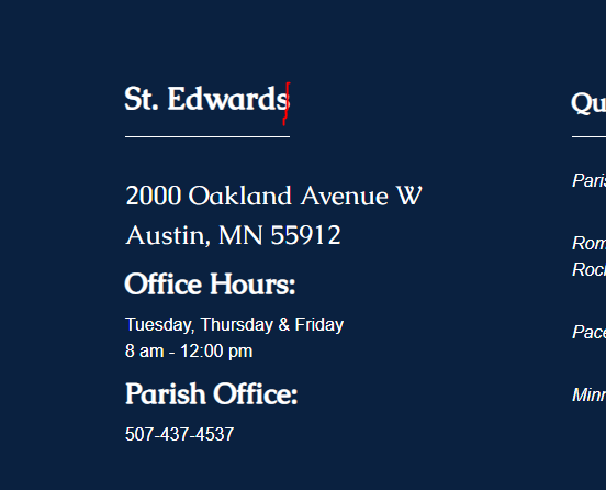 From the list: Footer ✔ Footer - Change Column Title St. Edwards to St. Edward, no 'S' Cody A. added this on Jun 28, 2019 Completed Jul 15, 2019 by Sam P. Assigned to Sam P. Notes image.png 37.6 KB • Download Comments & Events Sam Pohlman completed this to-do. Jul 15, 2019 at 7:20 PM