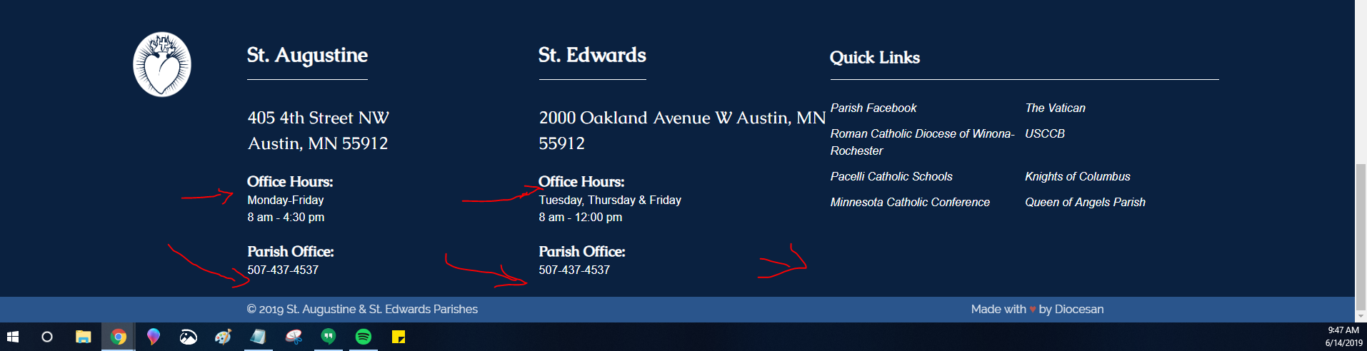 - More spacing between footer info i.e. St. Augustine, St. Edwards, and Quick Links and "site-info" i.e. Copyright info and Made with <3 by Diocesan stuff.