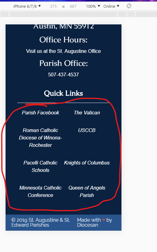 Stack the quick links on mobile to one column. It should be the same width as the other stuff in the footer or same total width as it is right now, but just one link per row and lessen the space between the links too please, not too much, but compress it a bit. Thanks.