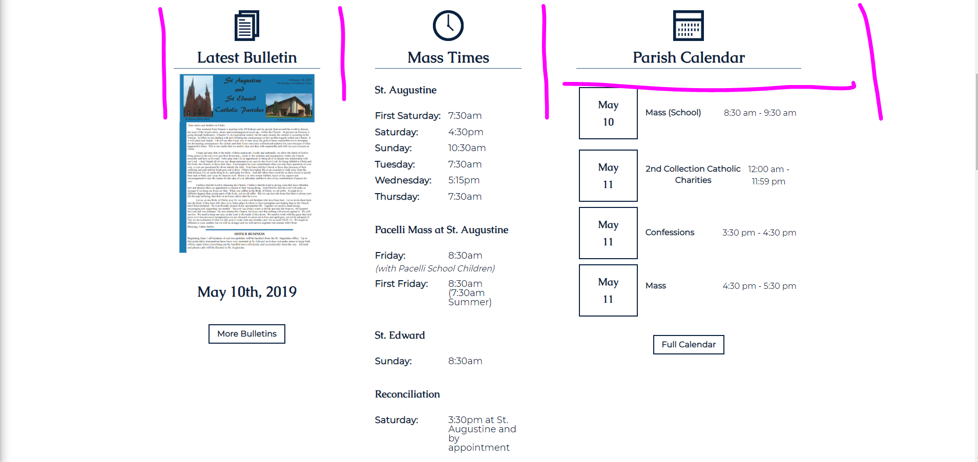 From the list: Homepage ✔ Homepage - Bulletin, Mass Tims & Parish Calendar should all be 1/3 Veronica A. added this on May 10, 2019 Completed May 22, 2019 by Sam P. Assigned to Sam P. Notes image.png 318 KB • Download Comments & Events Sam Pohlman completed this to-do. May 22, 2019 at 12:25 PM