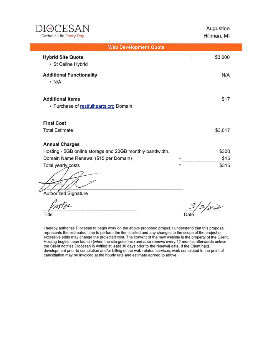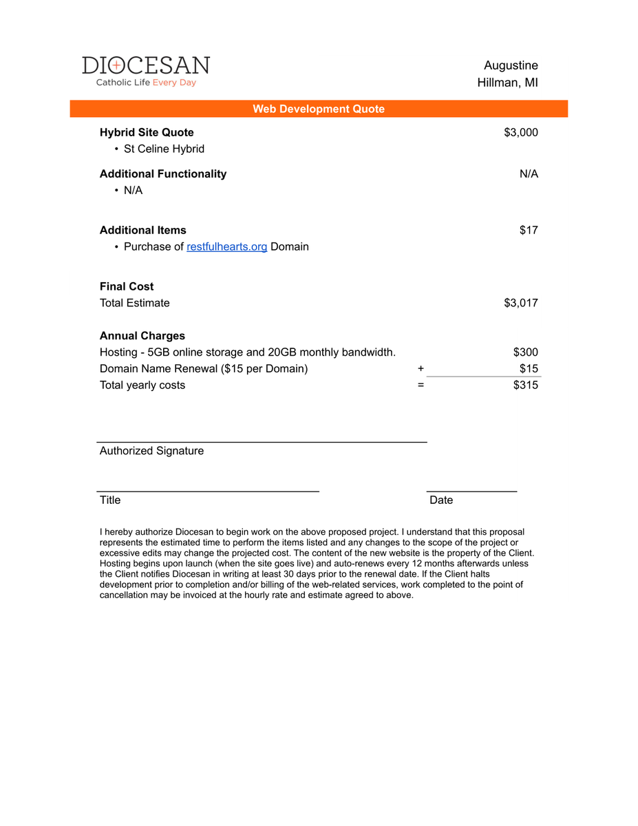 During the Deep Dive conversation, it was determined the St Celine Hybrid will be the foundation for your new website. After we apply your branding, fonts and colors, and content you will have a unique website that showcases St Augustine. I have also added the cost for the purchase of restfulhearts.org.