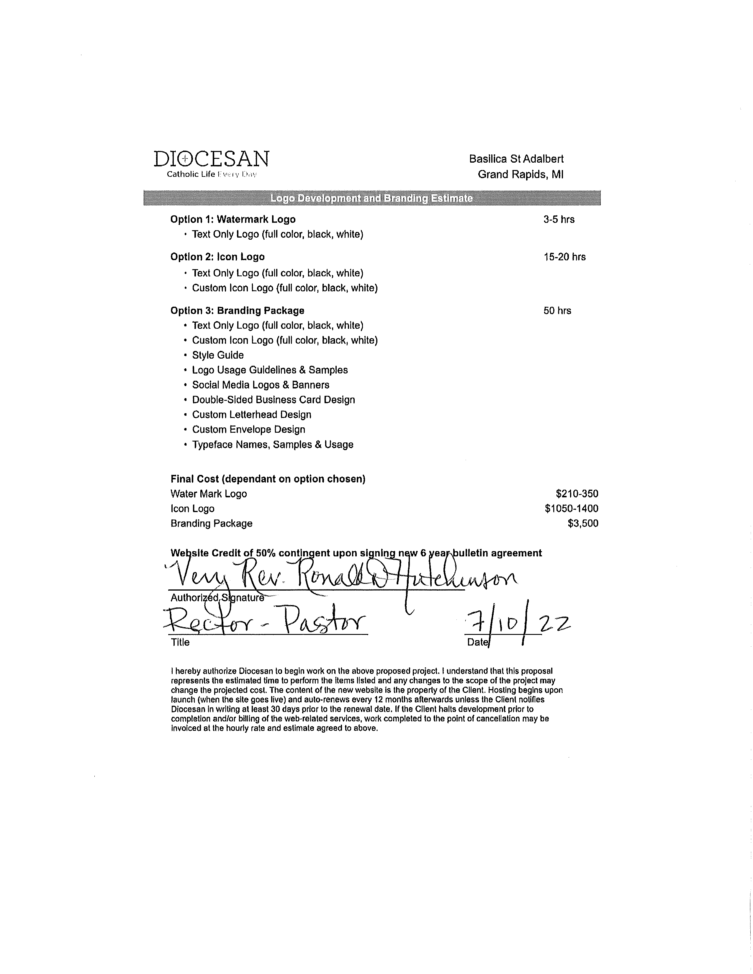 I think Fr. Ron tried to send the signed proposal. Here it is attached, please let us know what you need next.