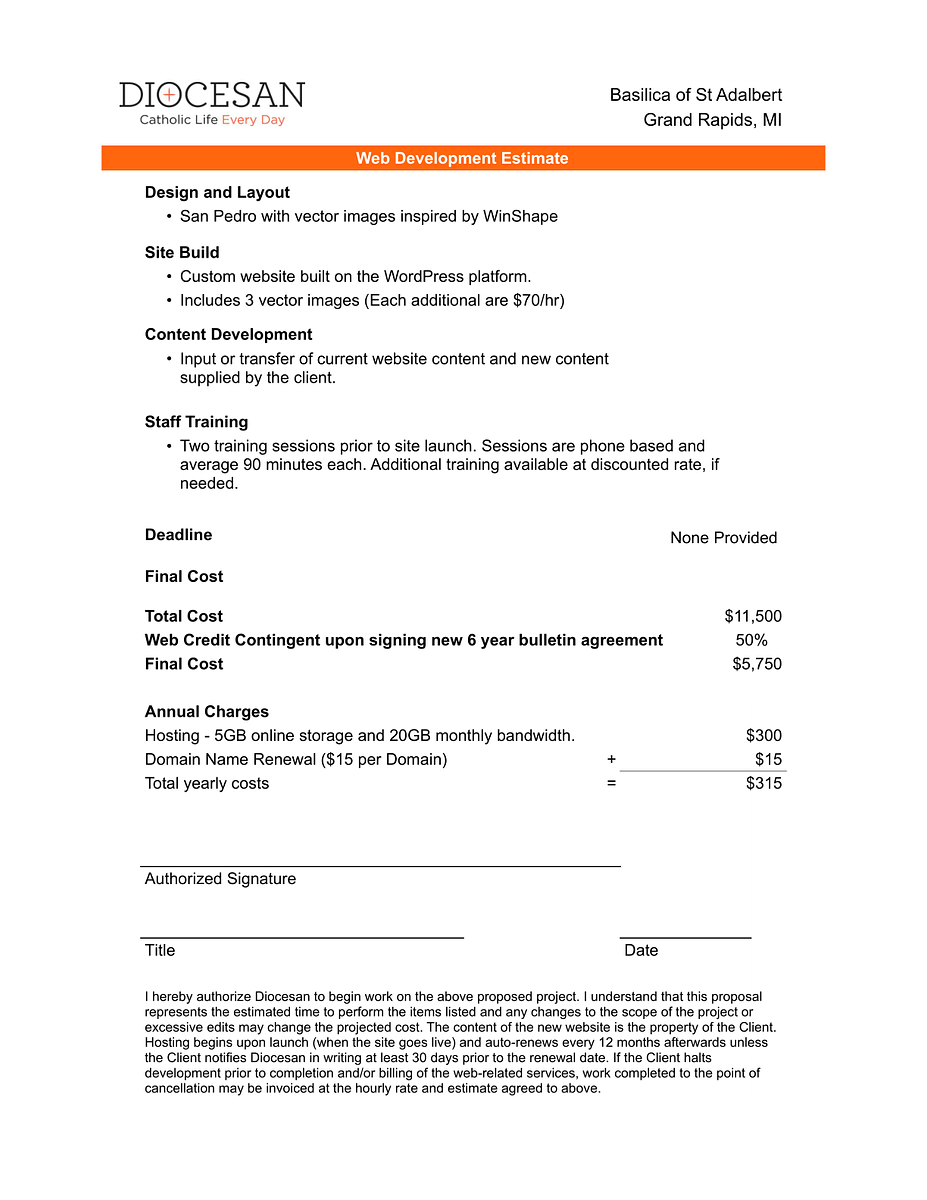 Thank you very much for taking the time to speak with us a couple of times during this consultation process. You provided a lot of great information about The Basilica and how you want a website to showcase St Adalbert. We are excited to work with you in bringing a new website to the parish.