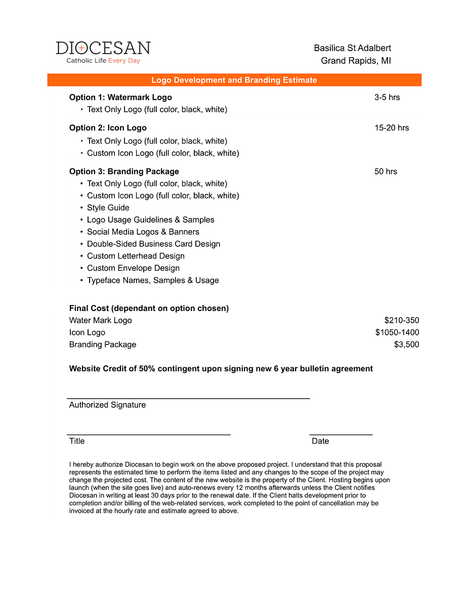 I spoke with my sales team regarding your project. If you were to sign a new 6 year bulletin agreement, the website and logo/branding would be 50% covered. Both the website proposal and the logo and branding proposal include this note. Once the signed proposals are signed and returned to me, I will let my sales team know to reach out regarding the bulletin side of things.