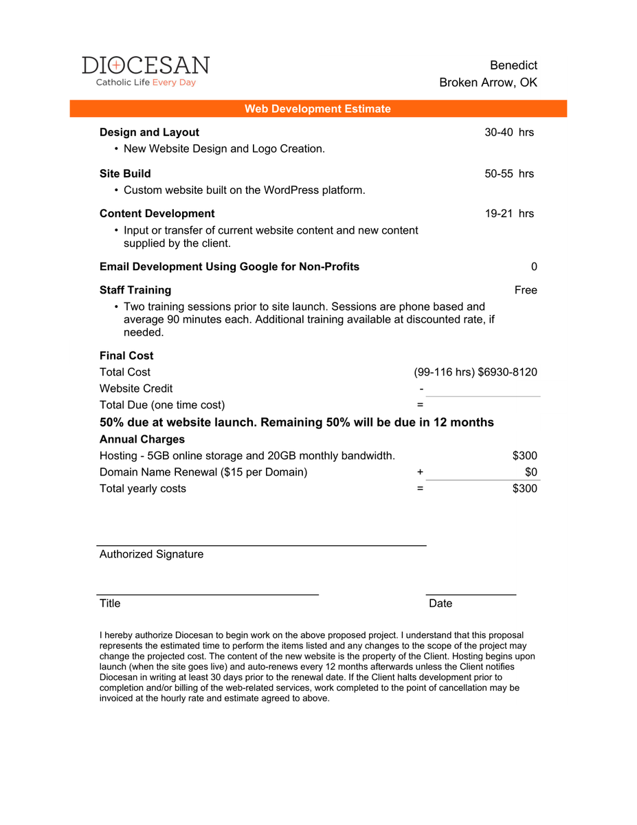One thing we can do and this has helped several parishes, is to work with you on a split payment. We will not be charging the website project until after your website is launched. At that time we could set up a half payment, and then a few months later the other half could be paid. What do you think of this option?