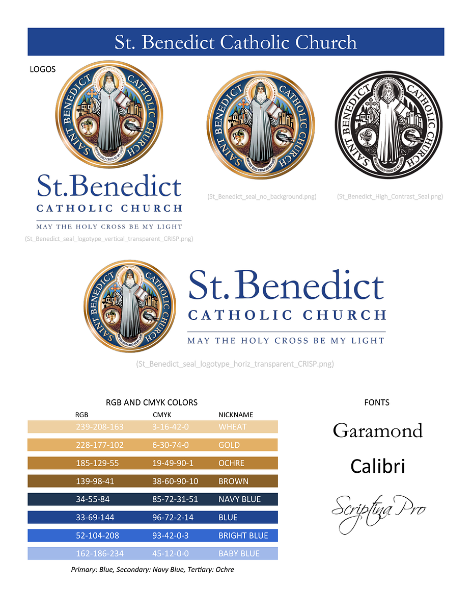 Danae, attached is a PDF of our logos, colors, and fonts. I’ve attached all four logos as png files. For our fonts, we use Calibri and Garamond, with Scriptina Pro as an accent occasionally. Please let me know if you need anything else.