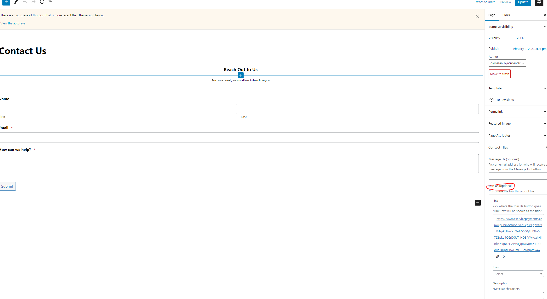 On Contact Us Page there is an area of the template that says "Join Us" please change the site this links to, to the following: https://www.eservicepayments.com/cgi-bin/Vanco_ver3.vps?appver3=Fi1giPL8kwX_Oe1AO50jRhKIJo0n7Z1pku4O6rD0UTnHO3iVYxvvxhHjRfLOeq662EvVVAEjqawDomKT1pbouf8KKptOBwDmGT9cNnpWIvA=