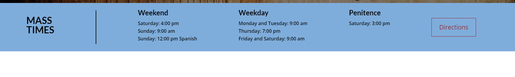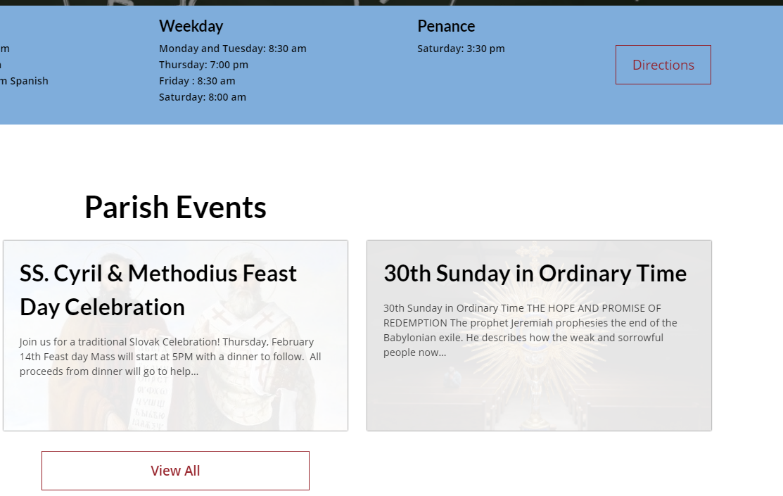 From the list: Build ✔ Directions button in masstimes wrap needs update Mary G. added this on Oct 19, 2018 Completed Feb 14, 2019 by Kyle B. Assigned to Kyle B. Notes image.png 70.5 KB • Download Comments & Events Veronica Alvarado, Project Manager Color: 8f1a22Maybe make button outline 2 px wide & text bold?Remember, both the Directions & View All button should match once all said and done. image.png 304 KB • Download Feb 13, 2019 at 3:01 PM Notified 1 person Kyle Brown completed this to-do. Feb 14, 2019 at 3:11 PM