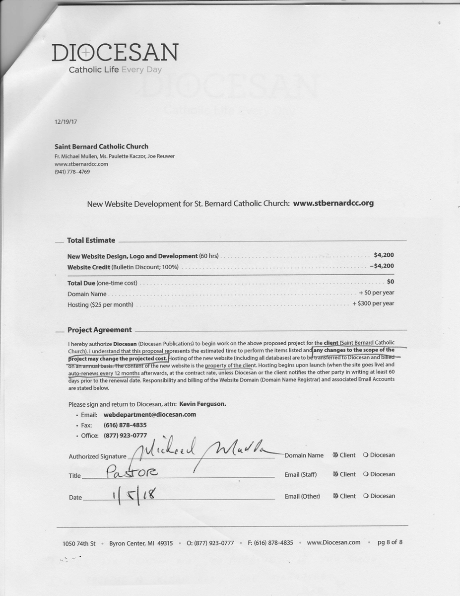 Good Day Lady and Gentlemen, The Pastor at St. Bernard's Church, Holmes Beach, Florida has signed the Web Development Proposal provided by Diocesan. I'll scan and forward a copy later this afternoon.