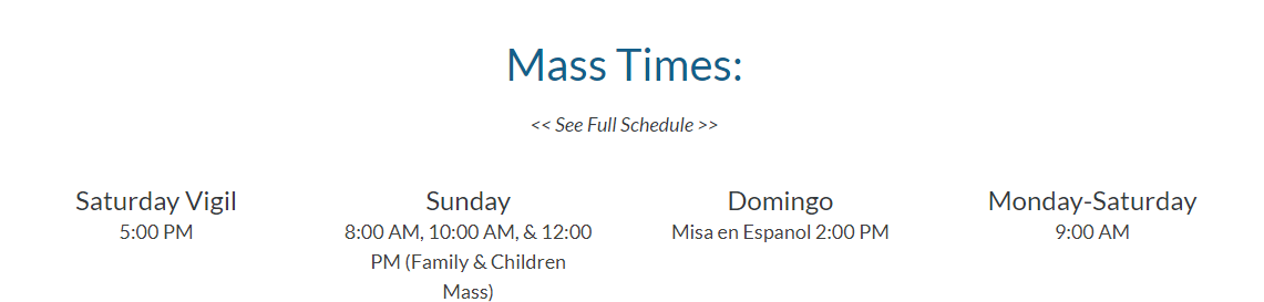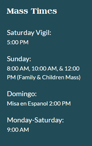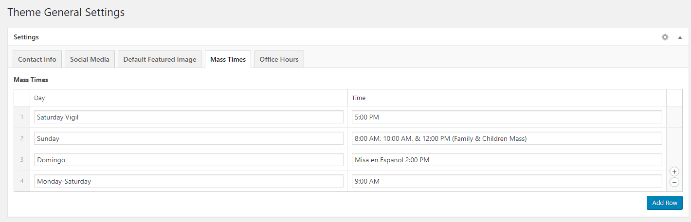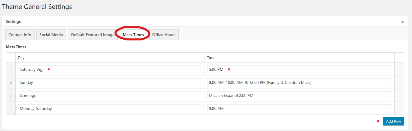 To update the Mass Times, go to your Dashboard and in the left menu, hover over Theme Settings and click Theme Settings. There will be a tab for Mass Times that you can edit. Be sure to click the blue Update button when you're finished so it saves your changes.