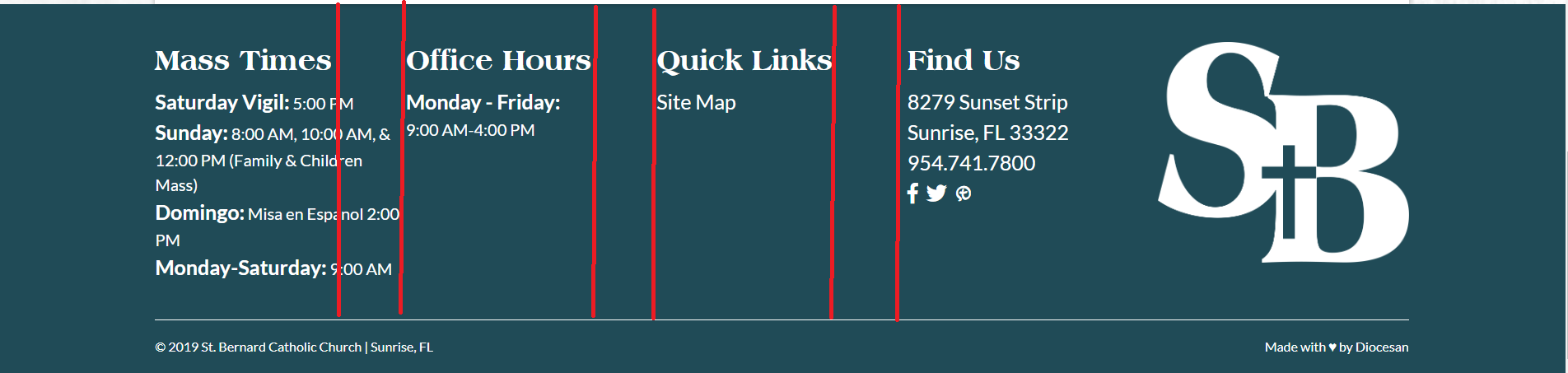 Mass Time goes too close to the Office Hours column in proof there is something over a 100px of space in between each column. Seems to lessen as it goes left to right, but that may be a