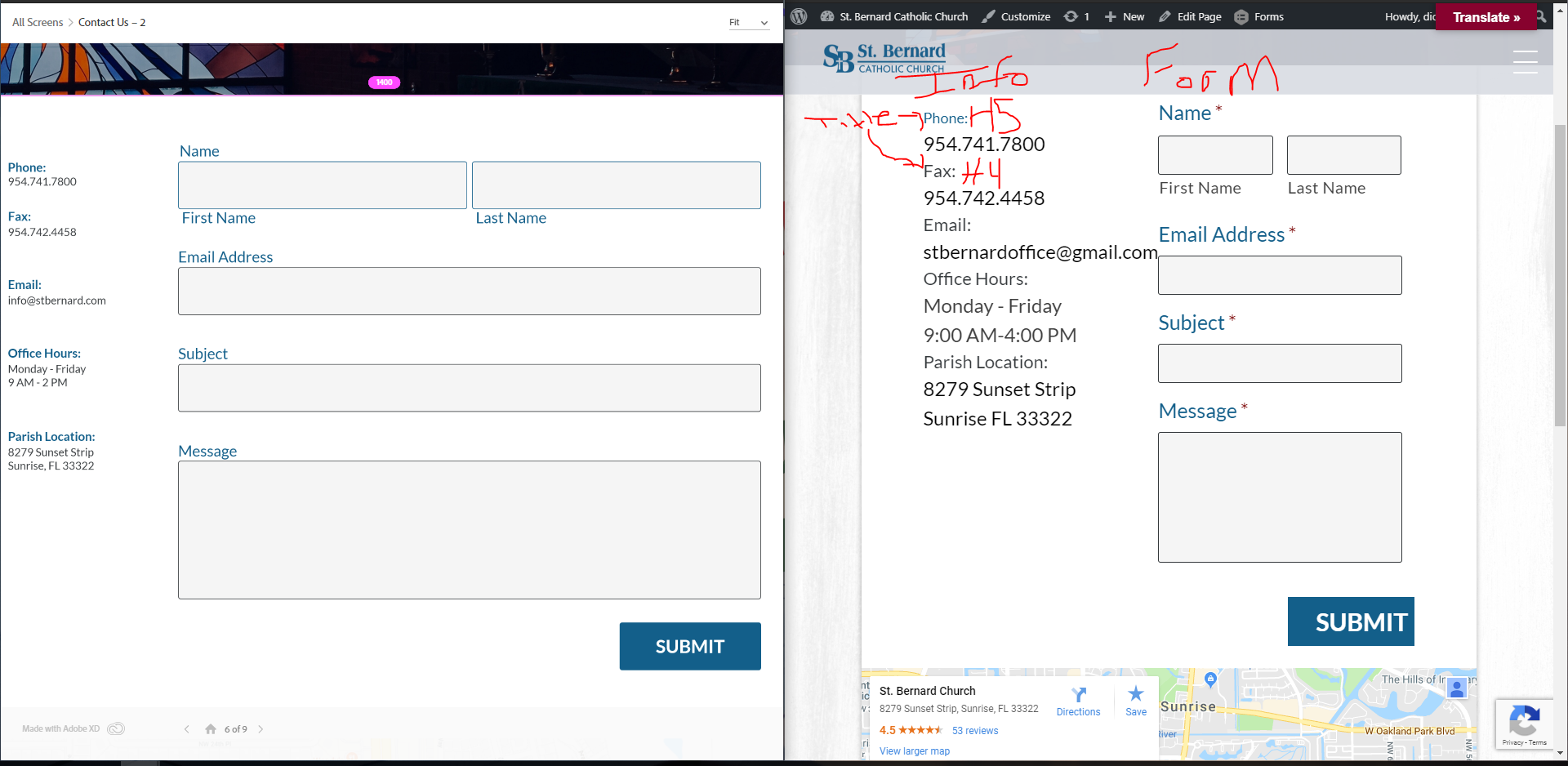 - Switch the Info titles ("Phone:", "Fax:", etc.) on the left side to h5 (see photo below), but make them Bolded like 600 font-weight.