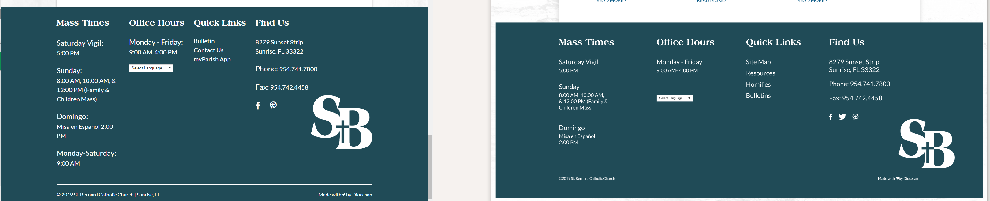 Yes, the logo should be closer to the bottom and maybe more spacing between items? (Mass Times, Office Hours, Quick Links, and Find Us)