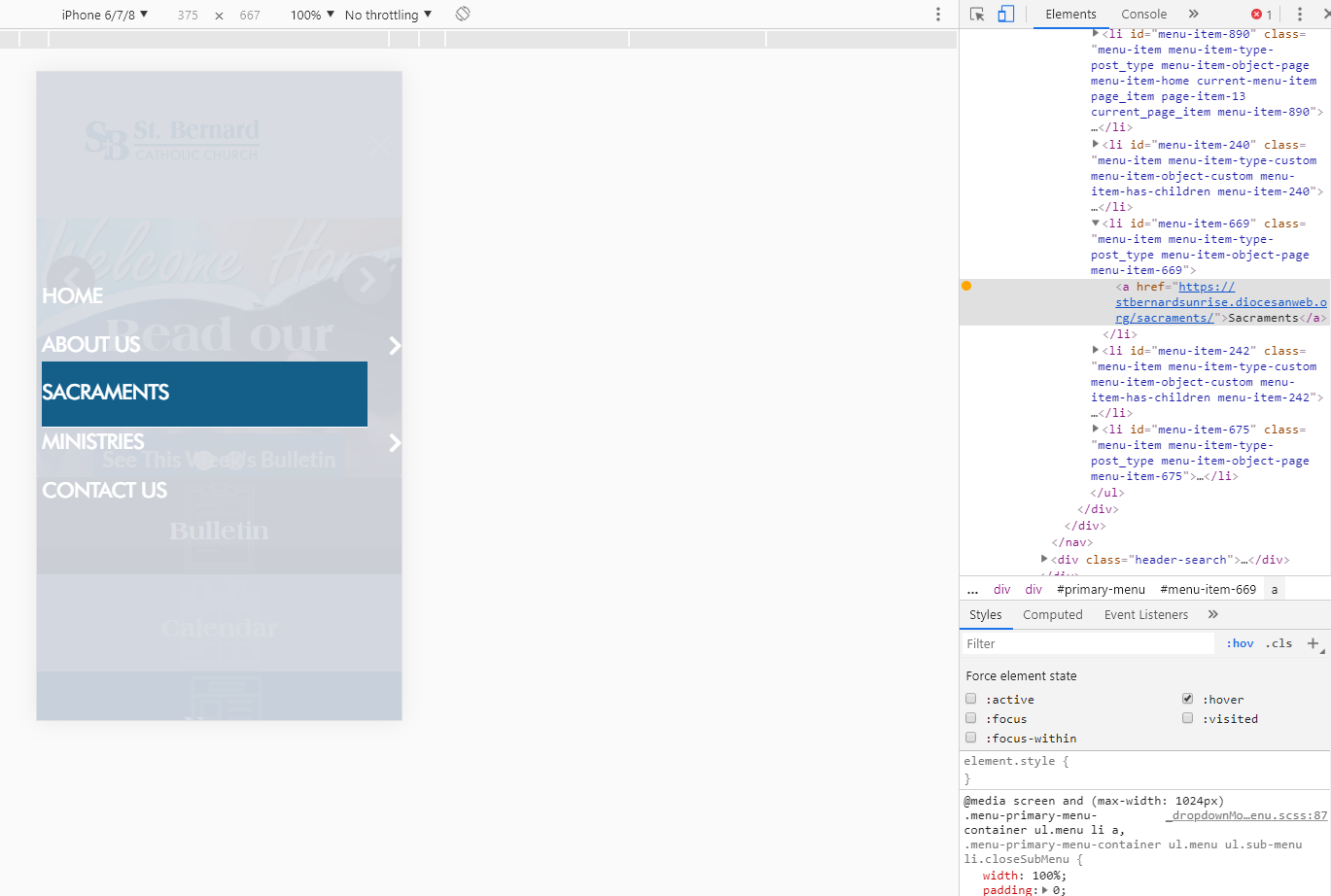 This seems to only happen for the main menu items, not for the sub-menu items, but I may have done it incorrectly, so make sure that nothing on the mobile menu has a hover effect. Thanks.